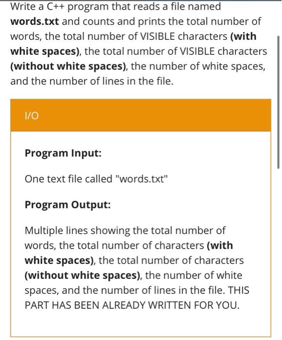 #include<iostream> #include<fstream> using namespace std; int main() { ifstream fin("word.txt"); //opening a file int line=1,word=0; //assign values to line and word char ch; int character=0,space=0; //character and space set to 0 fin.seekg(0,ios::beg); //move to begining of file while(fin) { fin.get(ch); //get every character if(ch==' '||ch=='\n') //new line or space encounterd word++; if(ch=='\n') //new line line++; if(!(ch==' '|| ch=='\n')) //not space or not a new line then its a character character++; if(ch== ' ') //space space++; } //display result cout<<"Number of characters without spaces:\t"<<character-1; cout<<"\nNumber of characters with spaces:\t"<<character+space-2; cout<<"\nNumber of words:\t\t\t"<<word; cout<<"\nNumber of lines:\t\t\t"<<line; cout<<"\nSpaces count:\t\t\t\t"<<space-1; fin.close(); //closing file return 0; }code image