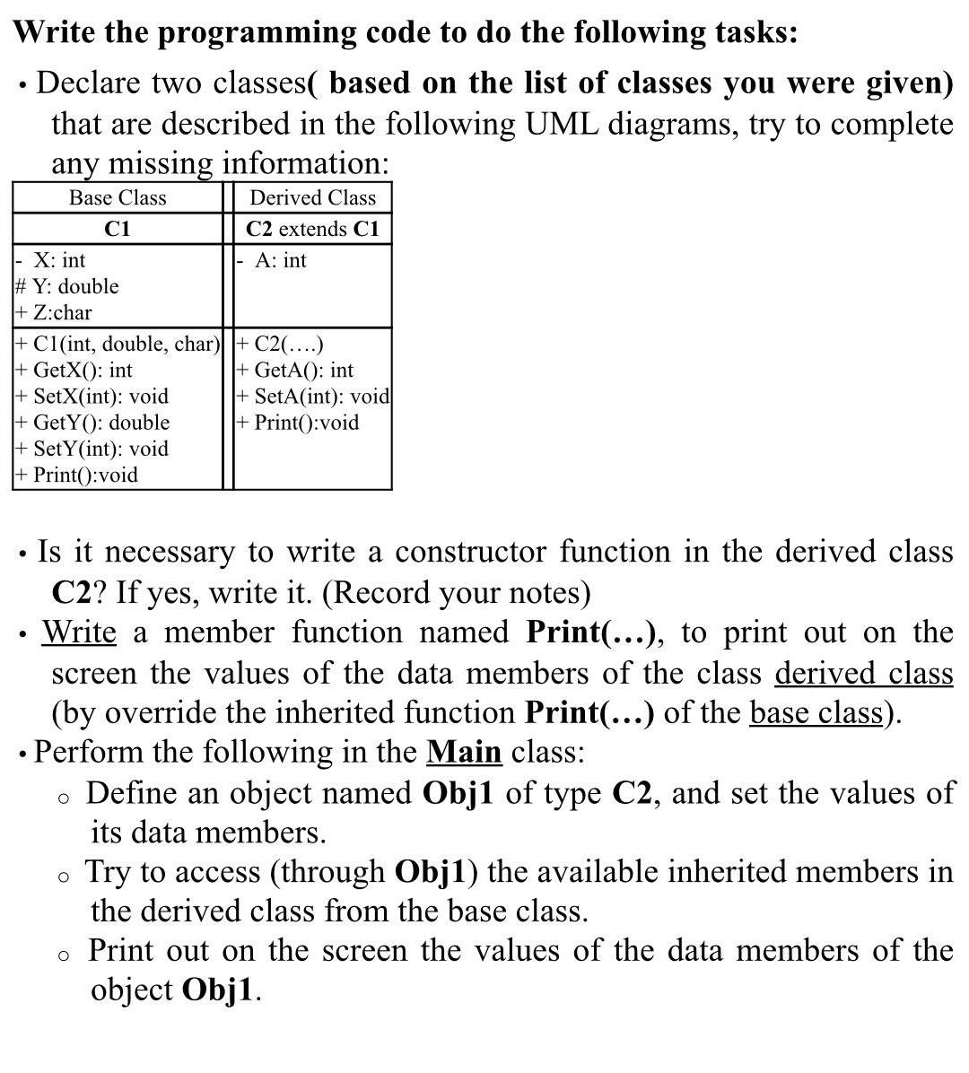 class C1 { public int X; protected double Y; public char Z; C1(int a,double b,char c) { X=a; Y=b; Z=c; } public int GetX(){ return X; } public void setX(int a){ X=a; } public double GetY(){ return Y; } public void SetY(int b){ Y=b; } public void print(){ System.out.println("X="+X); System.out.println("Y="+Y); System.out.println("Z="+Z); } } class C2 extends C1 { private int A; C2(int a){ super(10,12.2,'A'); A=a; } public int GetA(){ return A; } public void SetA(int a){ A=a; } public void print(){ System.out.println("A="+A); } } public class Main { public static void main(String[] args) { C2 Obj1=new C2(10); System.out.println("X="+Obj1.X); System.out.println("Y="+Obj1.Y); System.out.println("Z="+Obj1.Z); } }Answer: